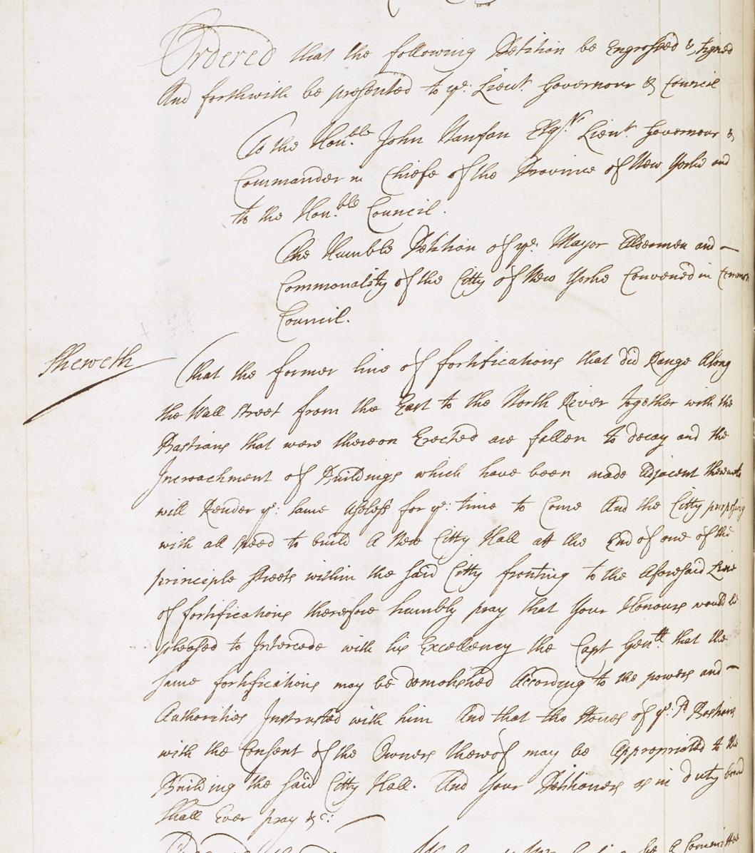 That the former line of fortifications that did range along the Wall Street from the East to the North River together with the Bastions that were thereon Erected are fallen to decay... and the City purposing with all speed to build a new City Hall at the end of one of the principle streets.... [we] humbly pray that... the same fortifications may be demolished... and that the stones of the said Bastions... may be appropriated to the building [of] the said City Hall.