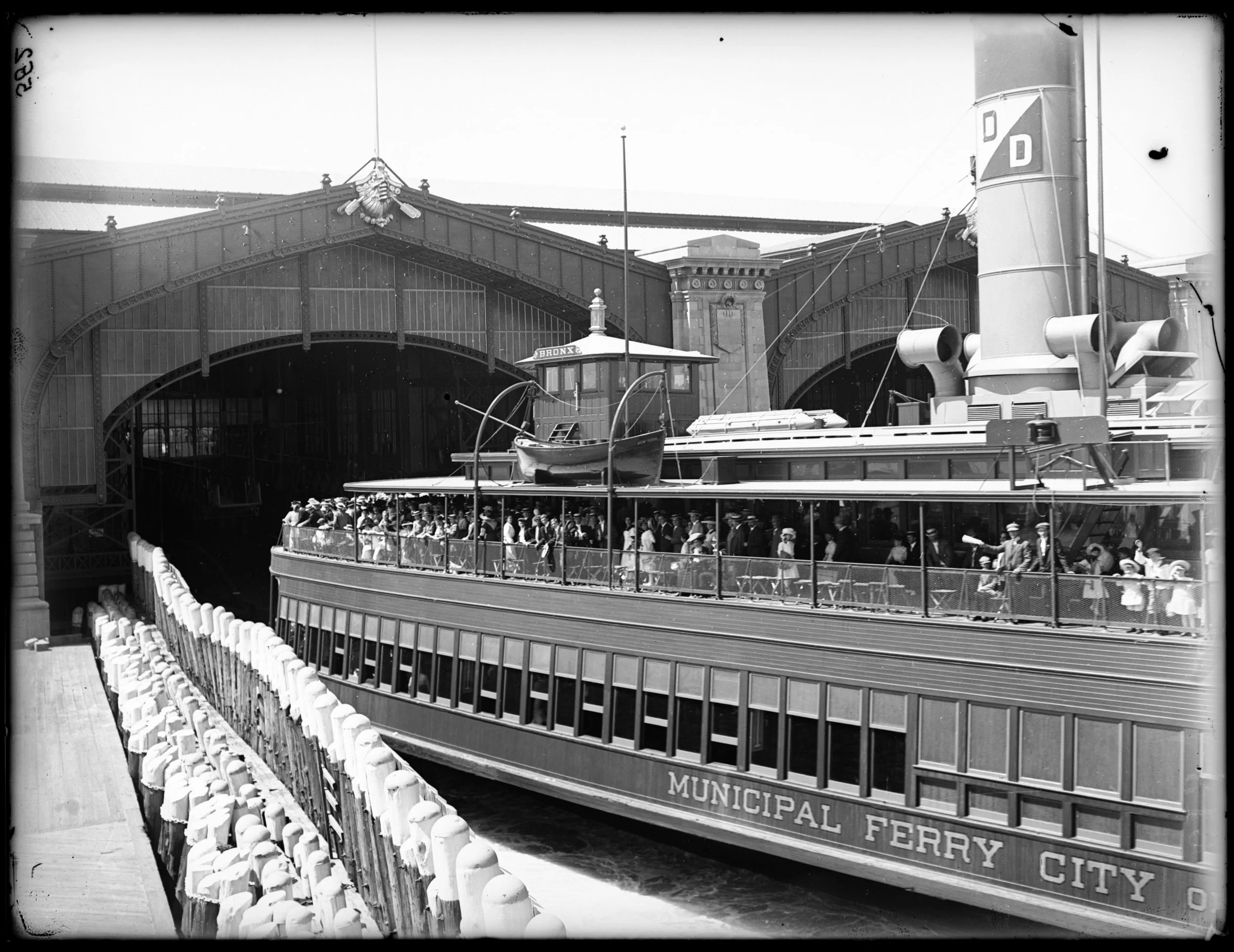 Municipal ferryboat “Bronx” traveling from Saint George (Staten Island) arriving at Whitehall Manhattan), circa 1905. Department of Docks and Ferries photographs, NYC Municipal Archives.