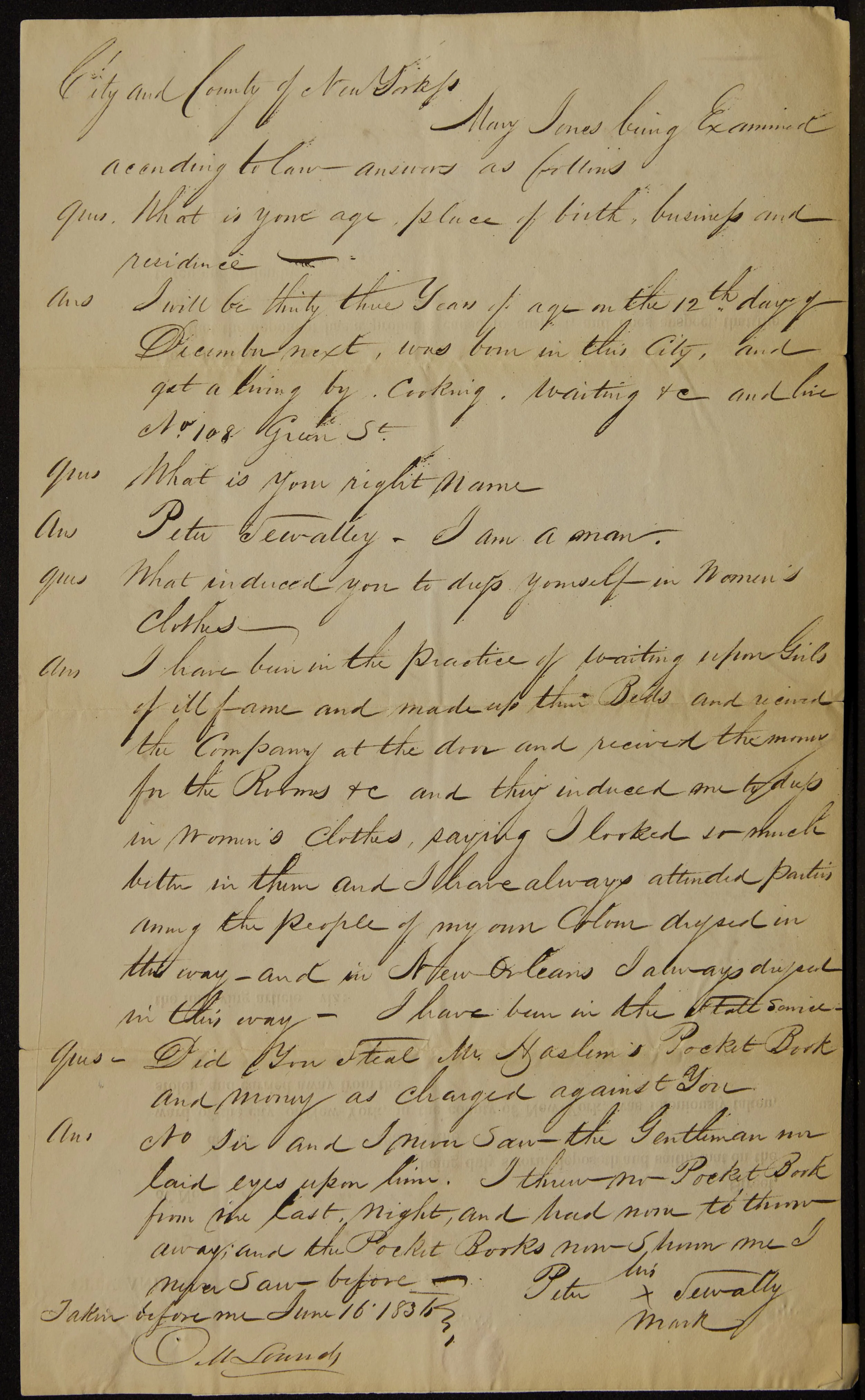 Testimony of Mary Jones, 1836. There are several remarkable things about this testimony, the fact that the court recognized her as “Mary Jones being Examined” and that Jones openly discussed her gender preference in court despite when asked “What is your right name?” responding “Peter Sewally—I am a man.” NYDA Case Files, NYC Municipal Archives.