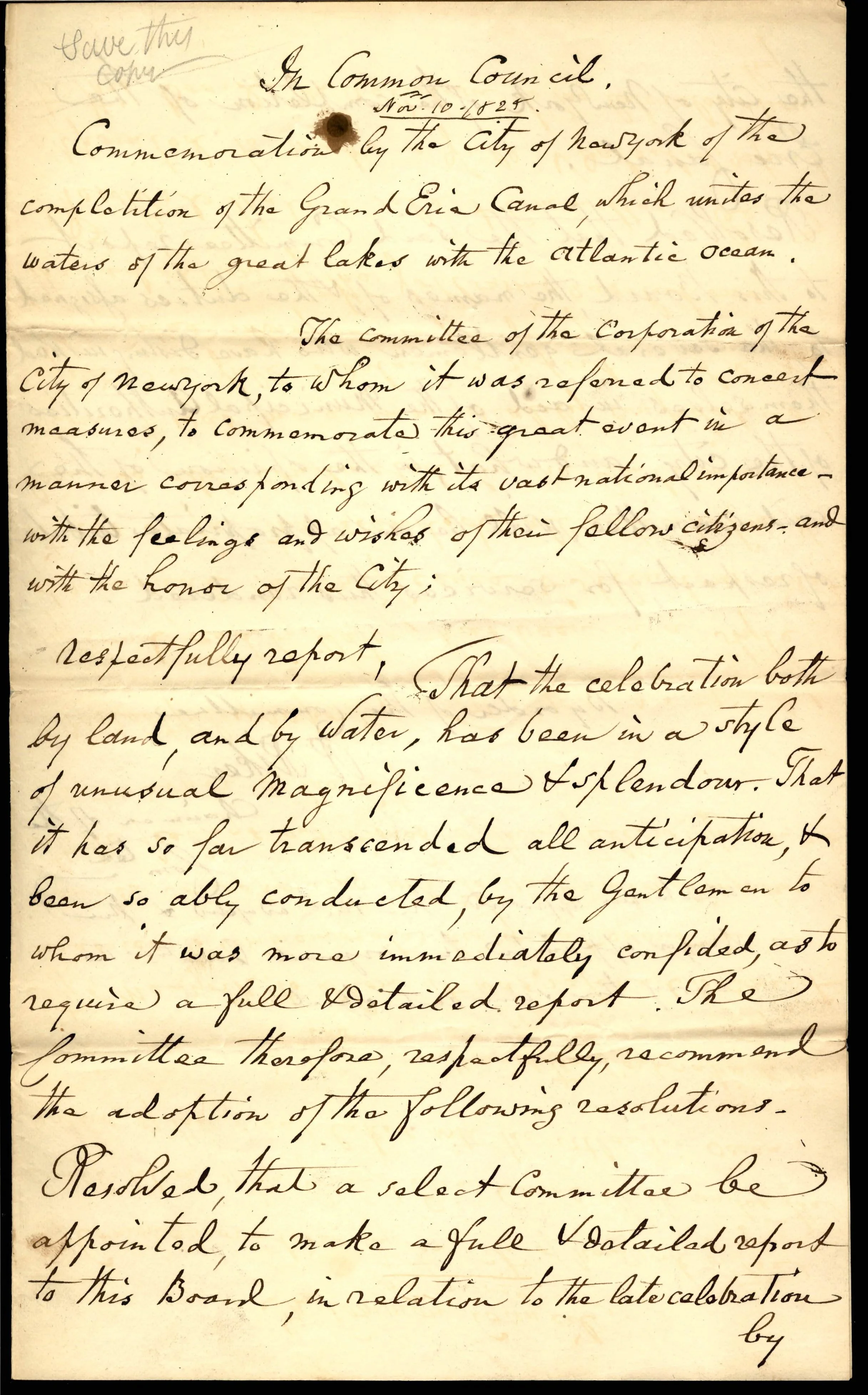 “Commemoration by the City of New York of the completion of the Grand Erie Canal, which unites the waters of the great Lakes with the Atlantic Ocean. The Committee of the Corporation of the City of New York,… respectfully report, that the celebration both by land, and by water, has been in a style of unusual magnificence & splendour. That is has so far transcended all anticipation….” Canal Committee, Common Council records, November 10, 1825. NYC Municipal Archives.