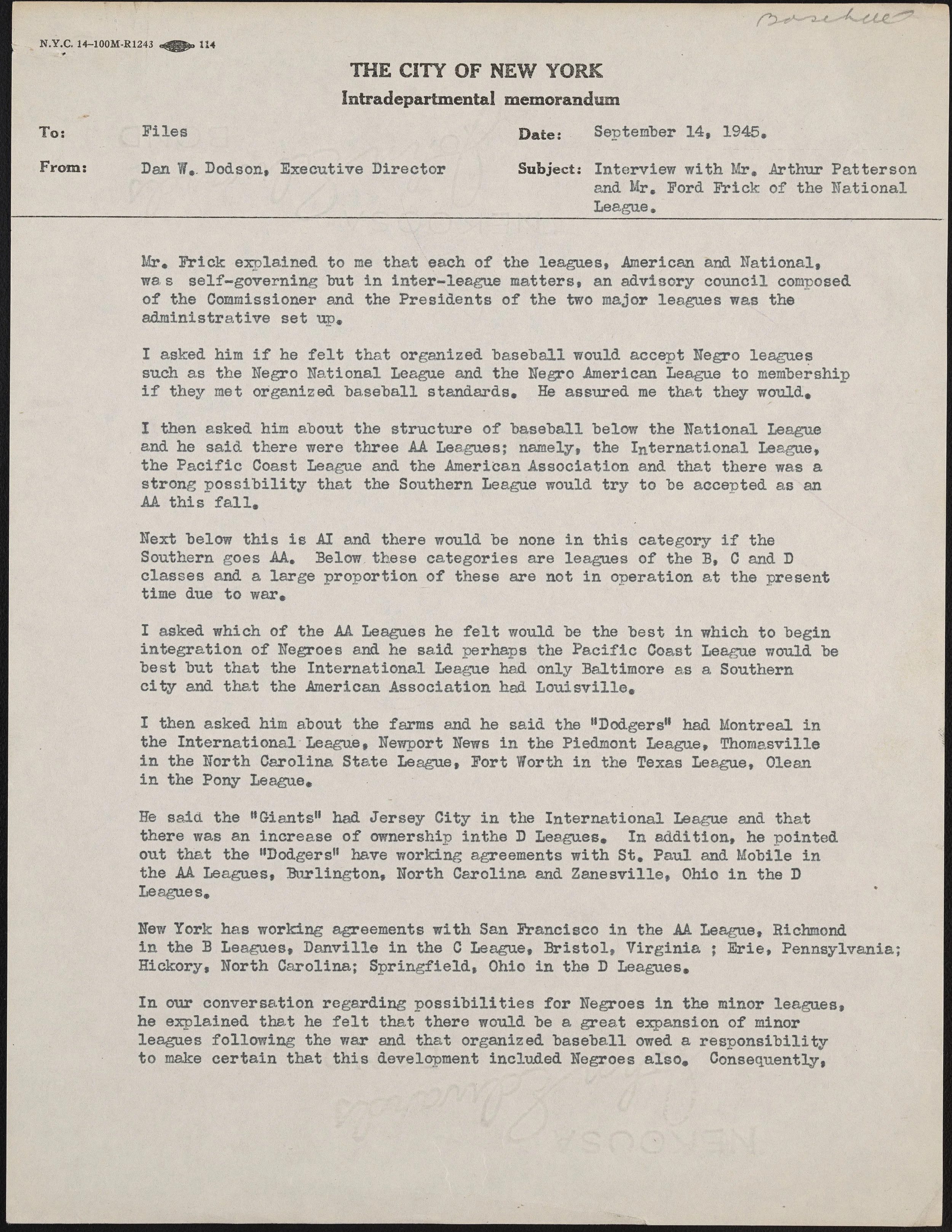 Memo from Dan Dodson regarding the issue of preserving the Negro Leagues, September 14, 1945. New York City Human Rights Commission, NYC Municipal Archives.