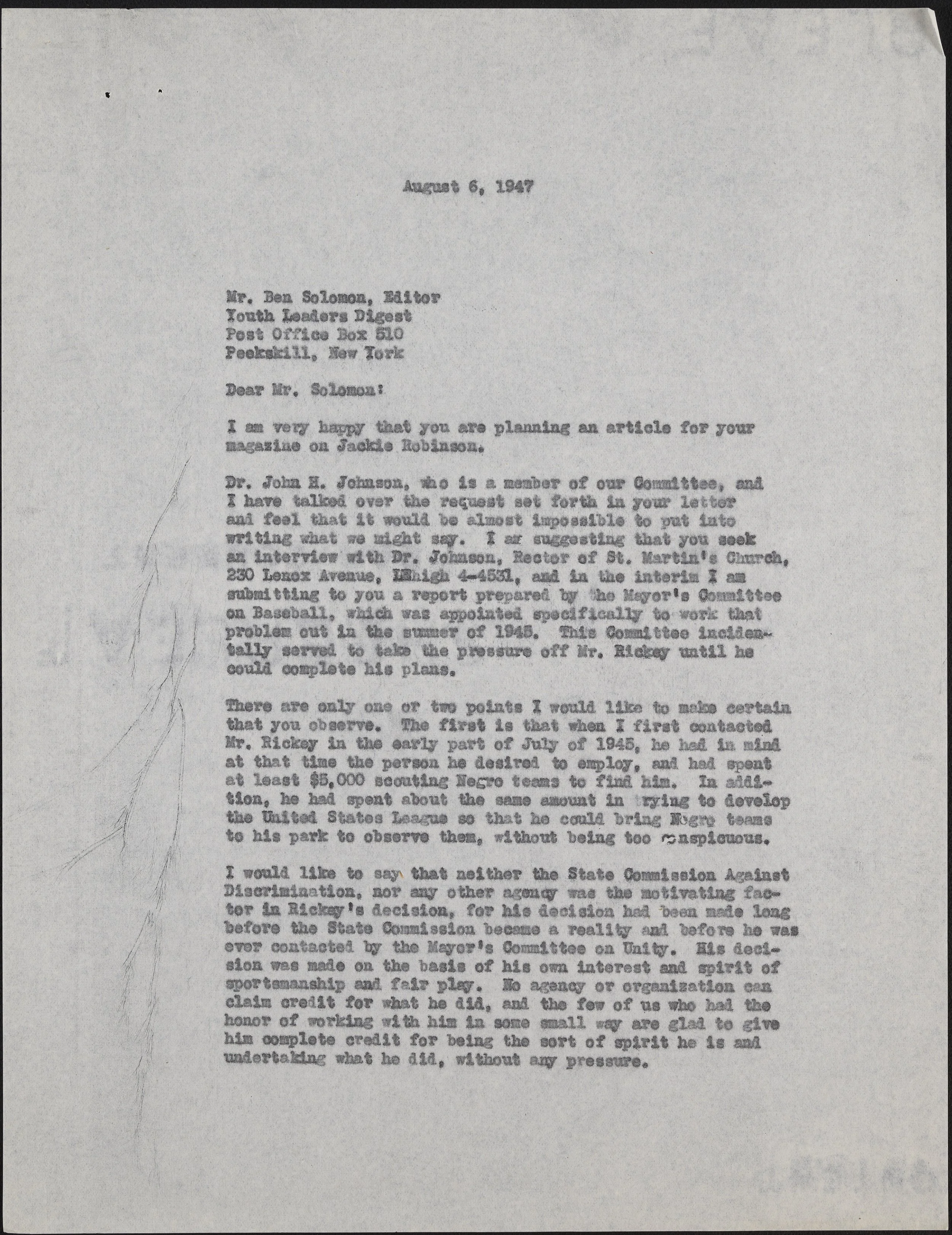 Letter from Dan Dodson to Ben Solomon, editor of Youth Leaders Digest, showing how Dodson pushed for the story to center on Rickey, August 6, 1947. New York City Human Rights Commission, NYC Municipal Archives.