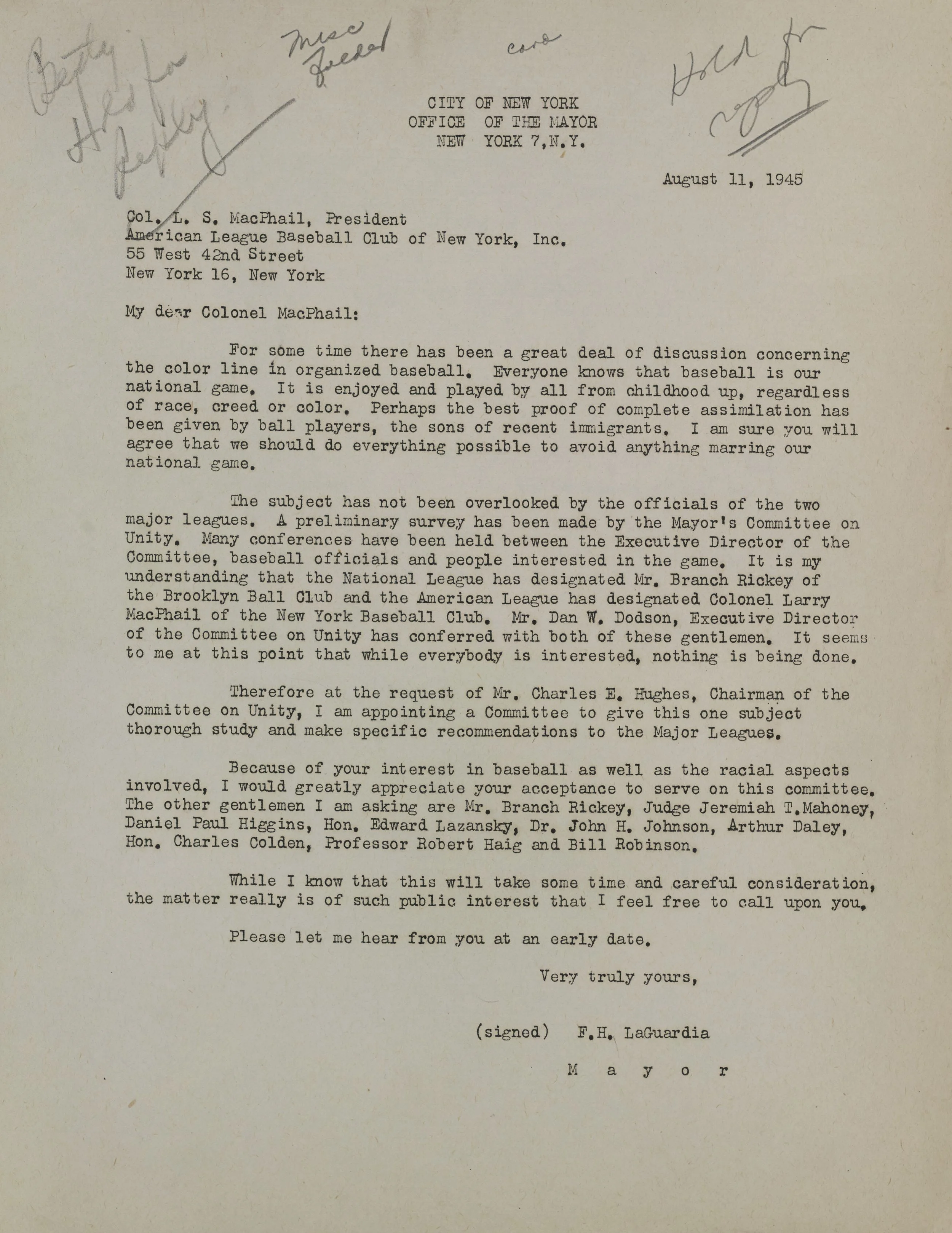 Letter from Mayor LaGuardia to Col. MacPhail, President of the New York Yankees, asking him to sit on the Committee on Baseball, August 11, 1945. Mayor LaGuardia papers, NYC Municipal Archives.
