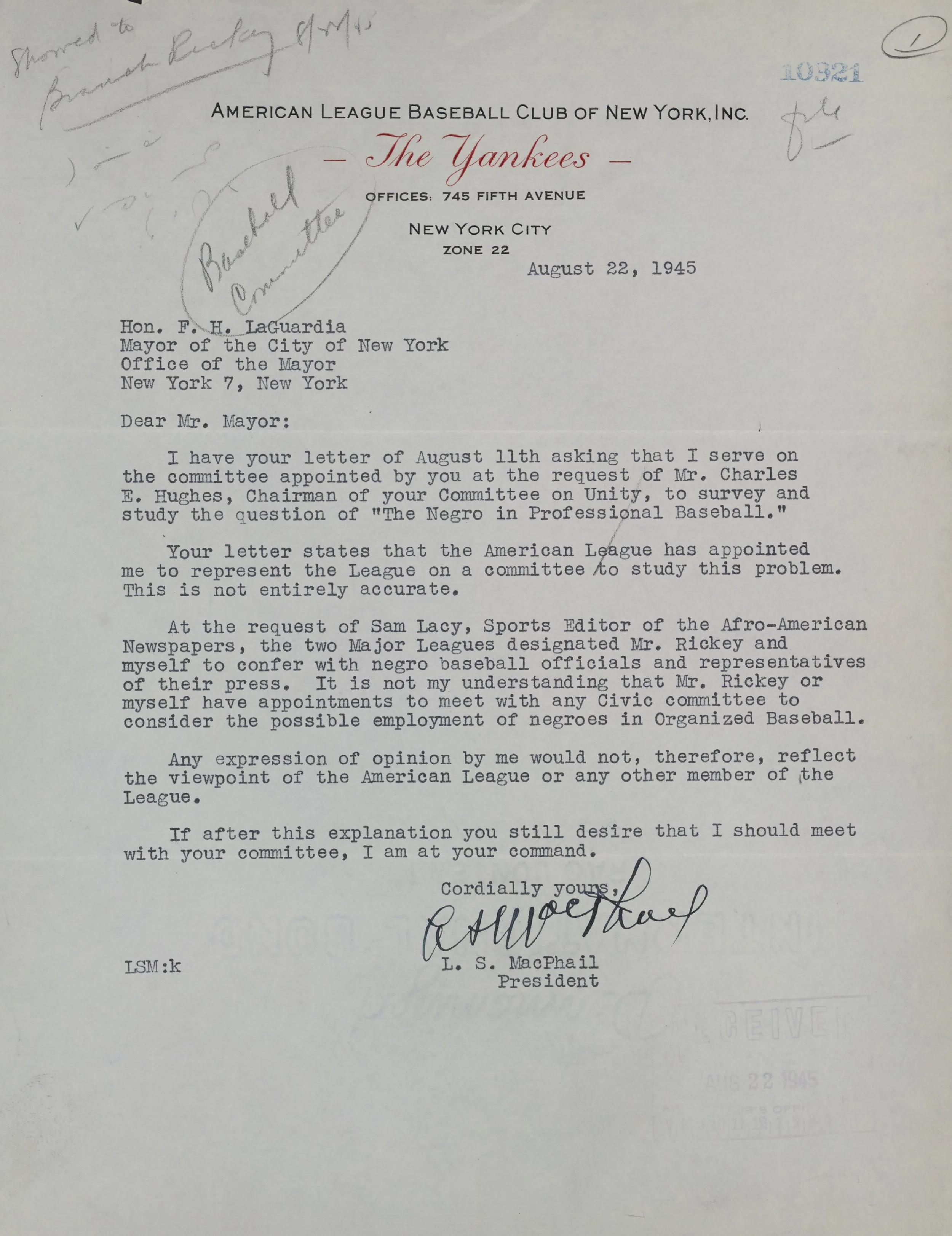 Reply to Mayor LaGuardia from Col. MacPhail, President of the New York Yankees, August 22, 1945. Mayor LaGuardia papers, NYC Municipal Archives.
