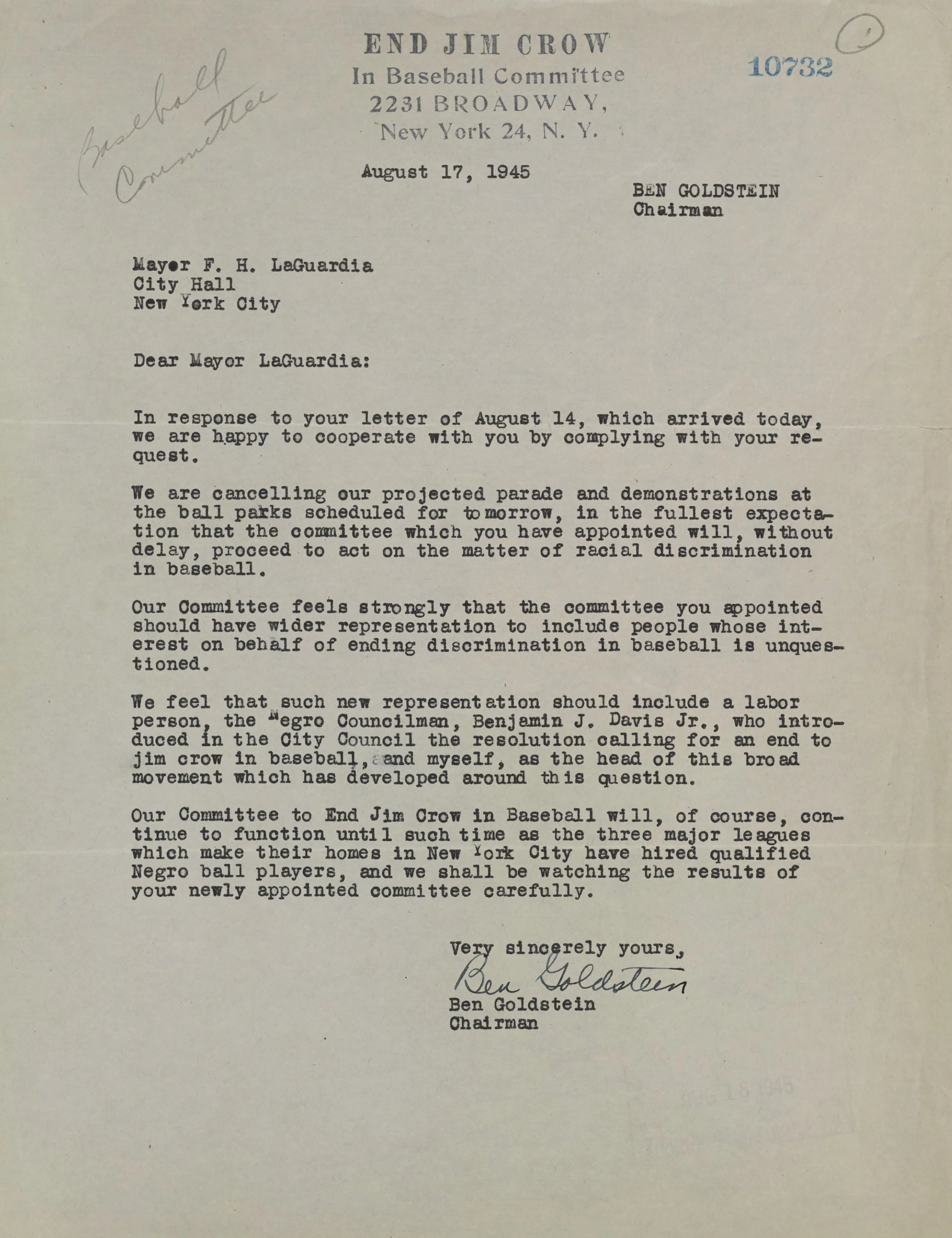 Letter from Mayor LaGuardia to Ben Goldstein asking him to halt the protests planned for the 18th at the Polo Grounds and Ebbets Field, August 14, 1945. Mayor LaGuardia papers, NYC Municipal Archives.