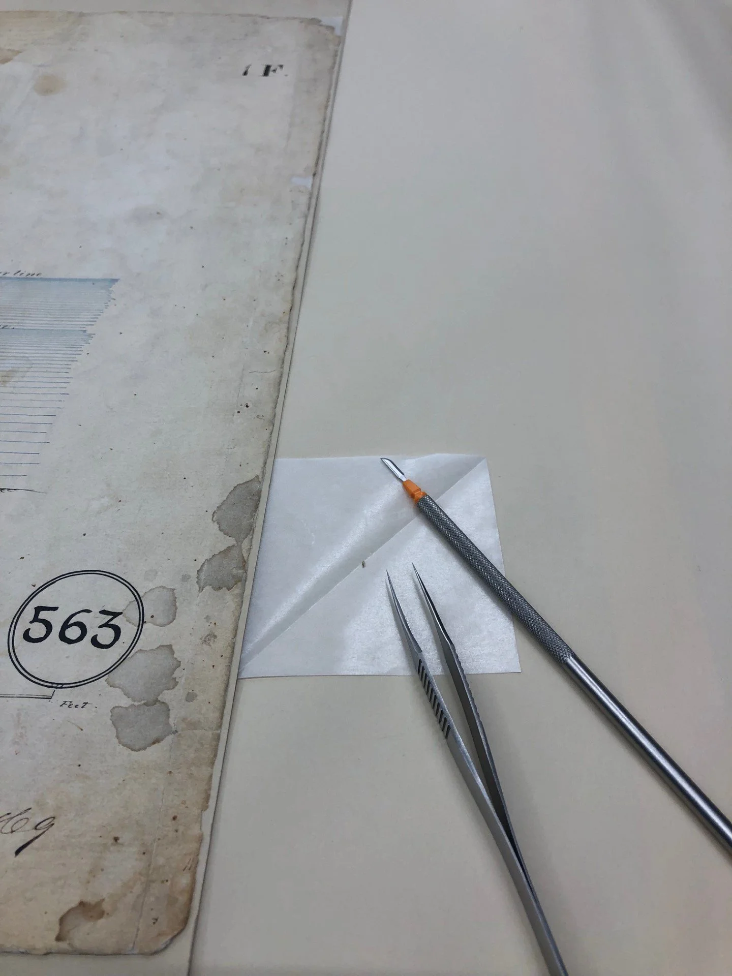 Prior to their accession by the Municipal Archives, the drawings spent the better part of a century in a dusty carpenter’s workshop beneath the Williamsburg Bridge under the purview of the Department of Transportation and its various historical iterations, where they were often consulted by City engineers for bridge repairs and renovations. Subjected to water leaks, mold, exhaust fumes from surrounding traffic, and rough handling, the drawings took a great deal of abuse. The primary condition issues we encountered included deteriorated paper supports, discoloration, tears and abrasions, local staining, faded media, and damage from mold and degraded adhesives.