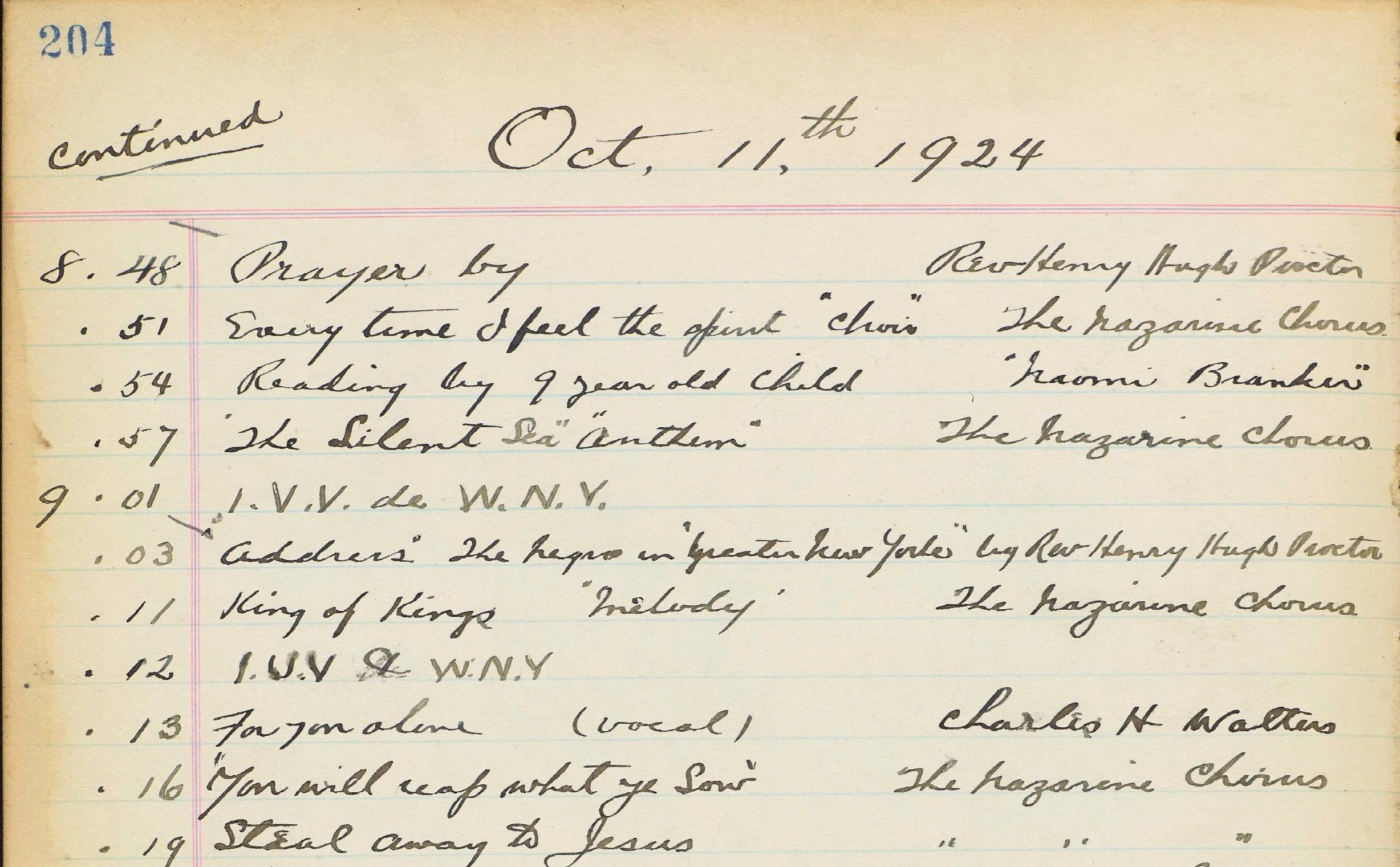 Among the earliest African American speakers on WNYC—if not the first—was the Reverend Dr. Henry Hugh Proctor, an early civil-rights leader who addressed listeners on the evening of October 11, 1924. He opened the broadcast with a prayer, followed by the Nazarene Chorus, based at his Brooklyn church, the Nazarene Congregational Church. Proctor is recognized as a key figure in the Social-Gospel movement, a significant precursor to the modern civil-rights movement.