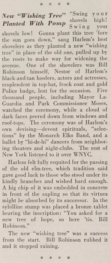 An unusual event celebrating legend, myth, and collective hope brought WNYC microphones to Harlem on November 4, 1934. The occasion was the replanting and dedication of the community’s “Wishing Tree” at 131st Street and Seventh Avenue, with Bill “Bojangles” Robinson presiding before public officials and a crowd of thousands. Also known as the “Tree of Hope,” the elm was believed to possess magical powers, according to reports in The Literary Digest.