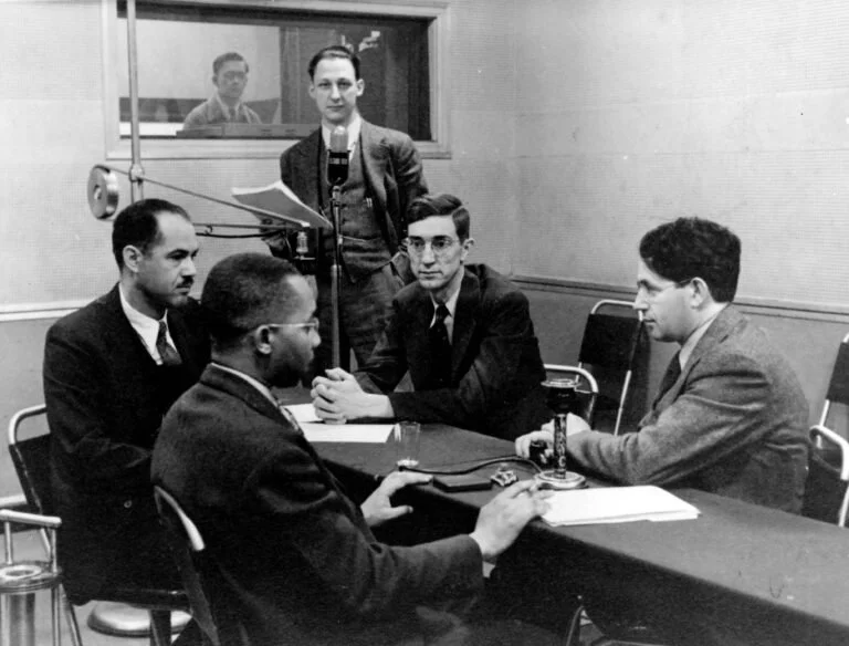 Kenneth B. Clark, Judge Hubert T. Delaney, Dr. Dan Dodson, and Mr. Albert Deutsch during broadcast of WNYC radio show, “How can we work for interracial understanding?” Photo courtesy of the Library of Congress.