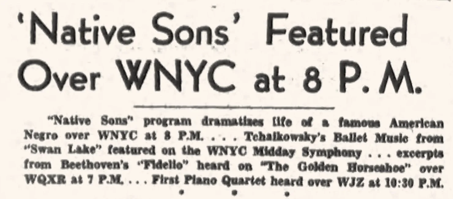 From May through July 1941, WNYC aired the pioneering thirteen-week dramatic series Native Sons, which portrayed the lives of significant historical Black figures. The biographical sketches were groundbreaking not only in content but in authorship: they were written by African Americans Kirk Lord and Frank D. Griffin at a time when few Black writers worked in radio beyond menial roles. Writing for the Baltimore Afro-American in August 1941, Griffin charged that commercial radio would not hire Black writers, arguing that as radio became a big business, Jim Crow practices had become entrenched in both studios and control rooms. Two years later, The New York Age noted Griffin’s hiring by the Congress of Industrial Organizations to write NBC’s Labor for Victory series, observing that he was “the only Negro at present writing for a network program.”