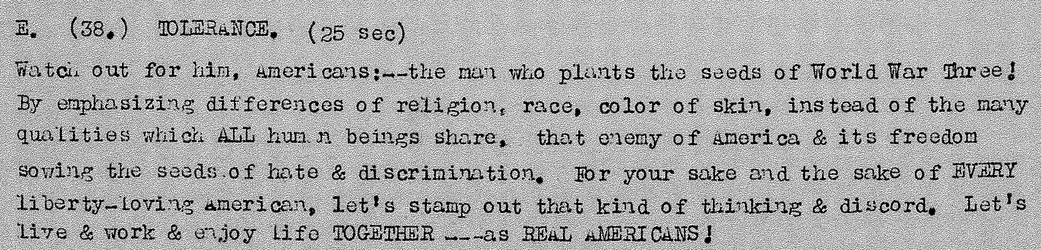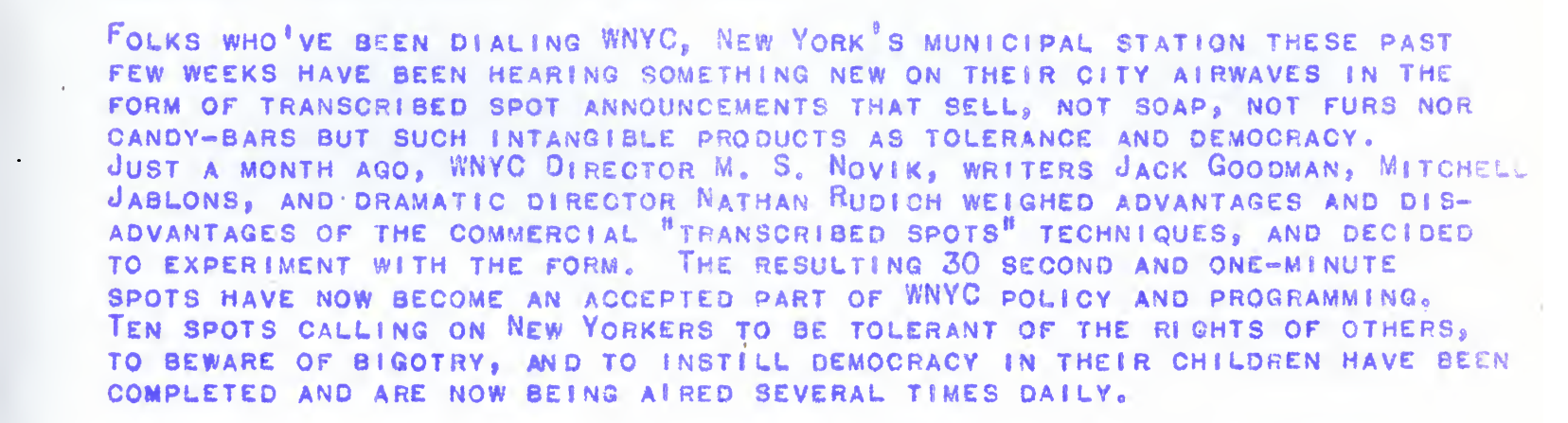 Script for a spot on tolerance from 1944. WNYC Archive Collections.
