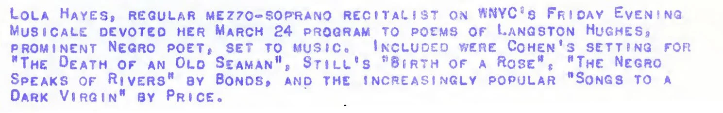 Hughes returned to WNYC in 1944 as a guest on mezzo-soprano Lola Hayes’s weekly program Tone Pictures of the Negro in Music, which highlighted African American composers and their work. The November 29 broadcast focused on musical settings of Hughes’s poetry, and he read from his opera Troubled Island. Other guests during the program’s run included Abbie Mitchell, Will Marion Cook, Hall Johnson, and Clarence Cameron White.