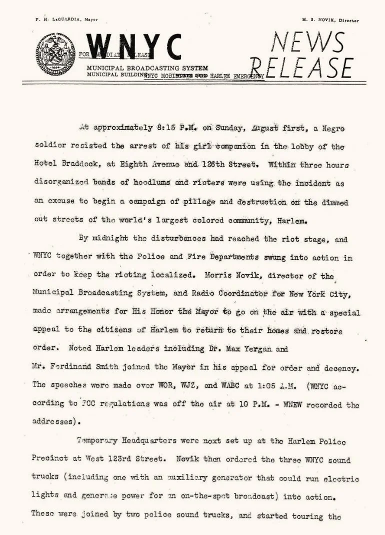 Page one of a four-page WNYC press release on the 1943 disturbances in Harlem. NYC Municipal Library vertical files.