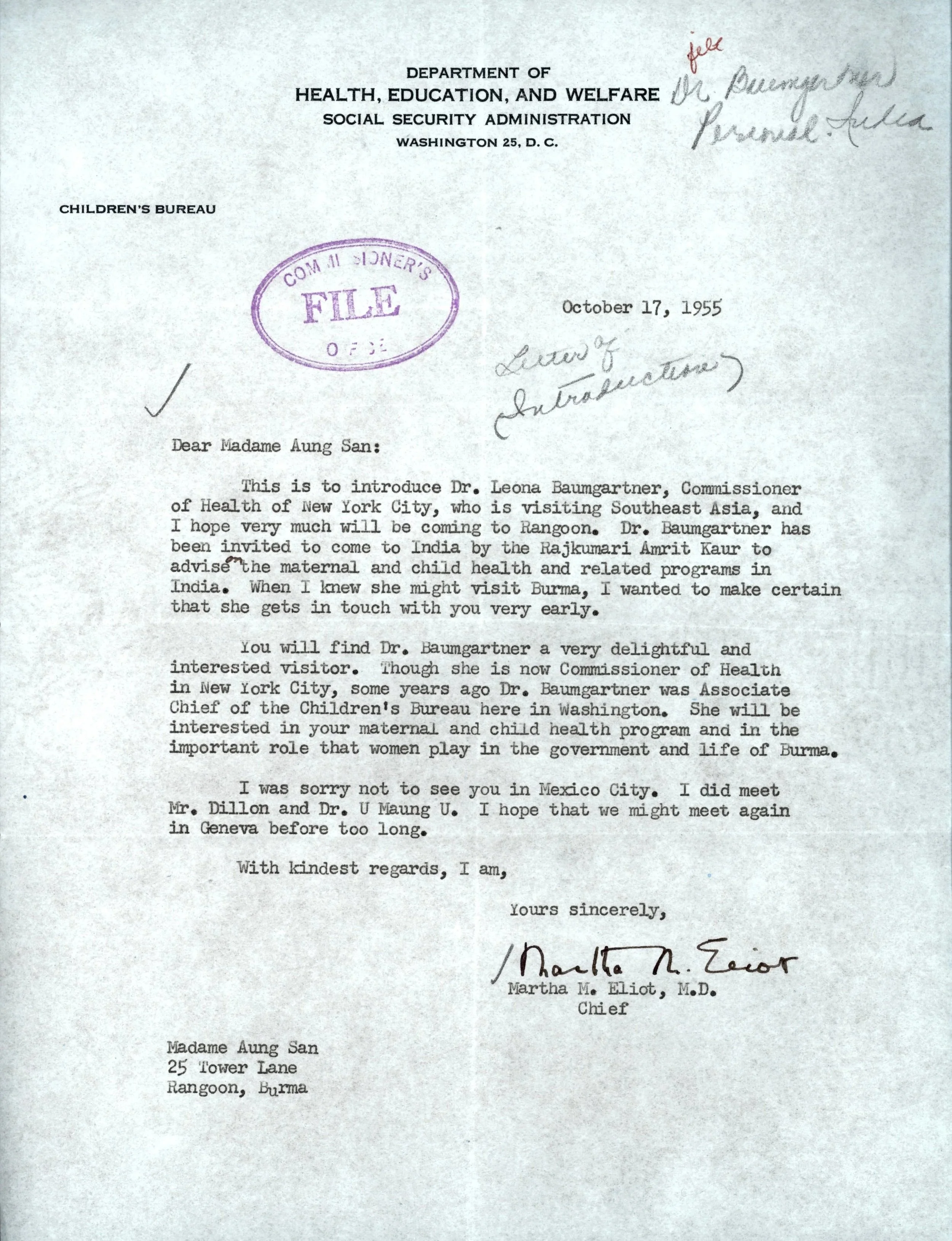 Letter of introduction for Commissioner Baumgartner and the wife of the late Burmese independence leader Aung San ahead of her trip to Southeast Asia. REC0050 Health Commissioners Papers, NYC Municipal Archives.
