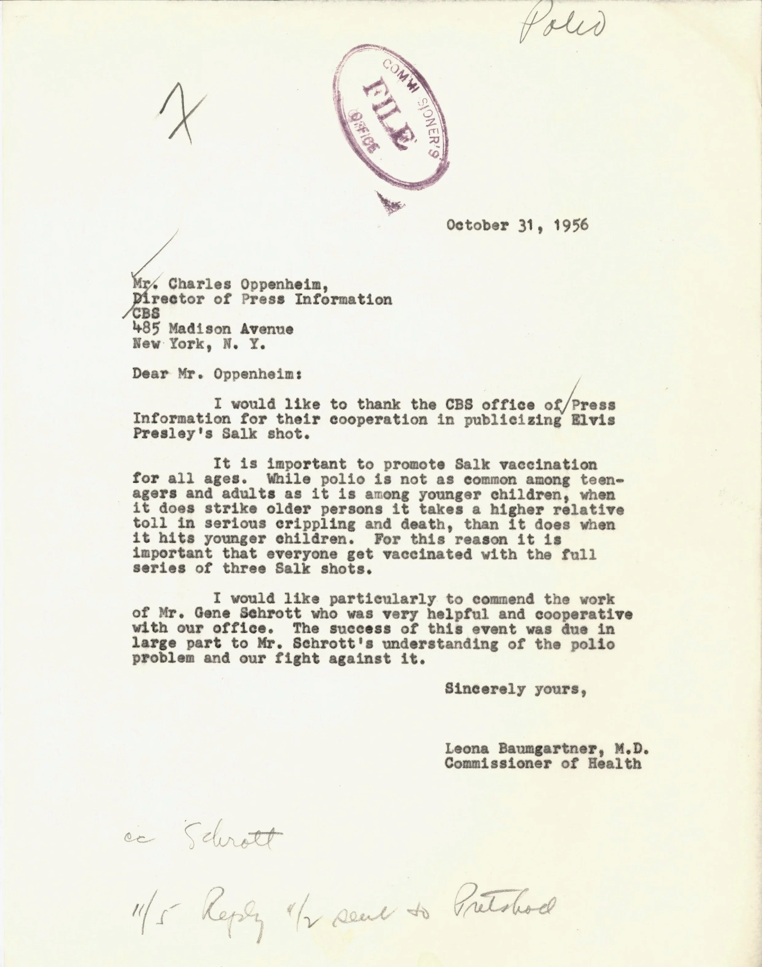 Letter from Commissioner Baumgartner to the CBS Office of Press Information thanking the network for helping arrange for Elvis Presley to get the polio vaccine at their New York television studio in 1956. REC0050 Health Commissioners Papers, NYC Municipal Archives.