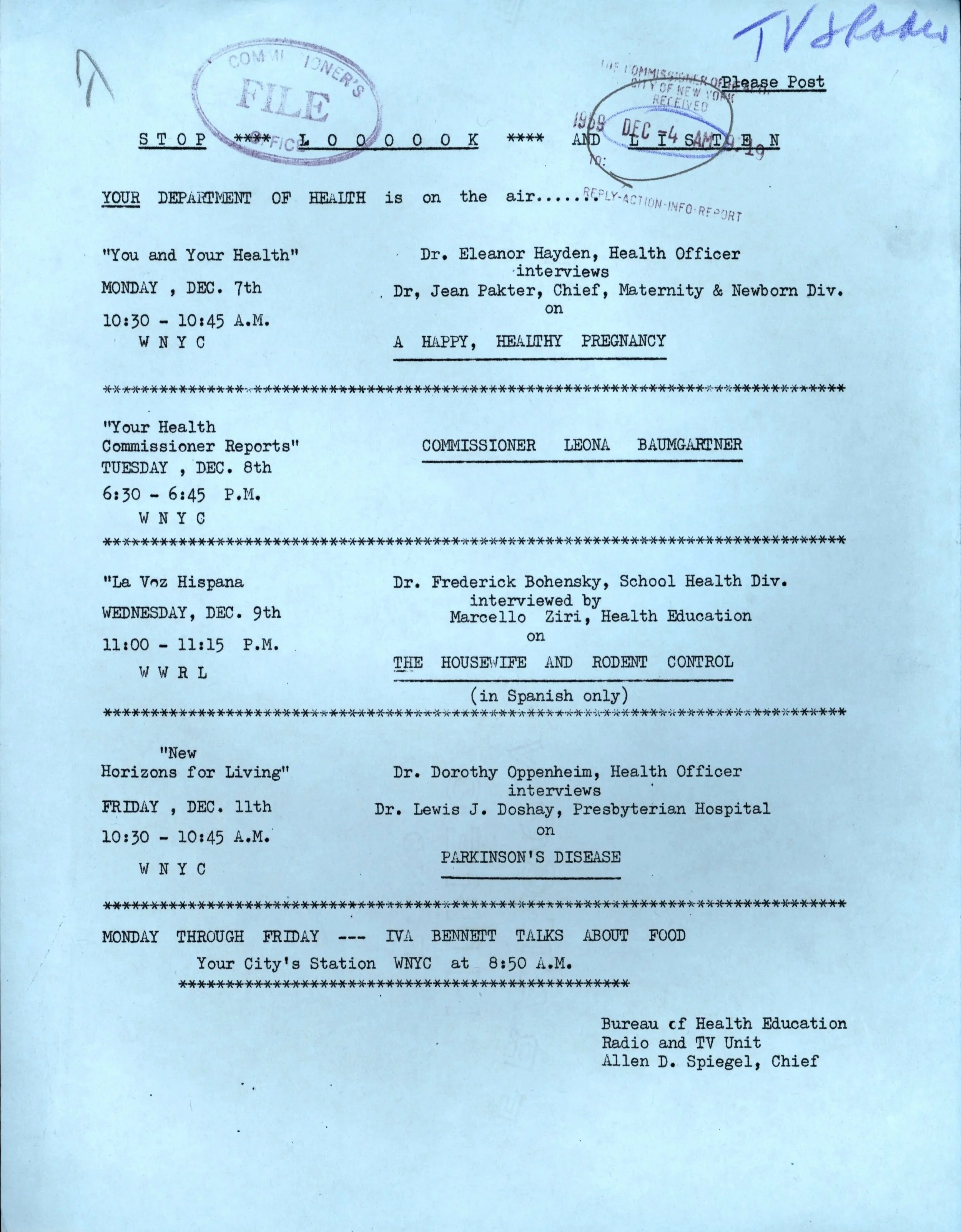 Radio program listing for 1959 health-related broadcast featuring Commissioner Baumgartner as well as other public health officials. REC0050 Health Commissioners Papers, NYC Municipal Archives.