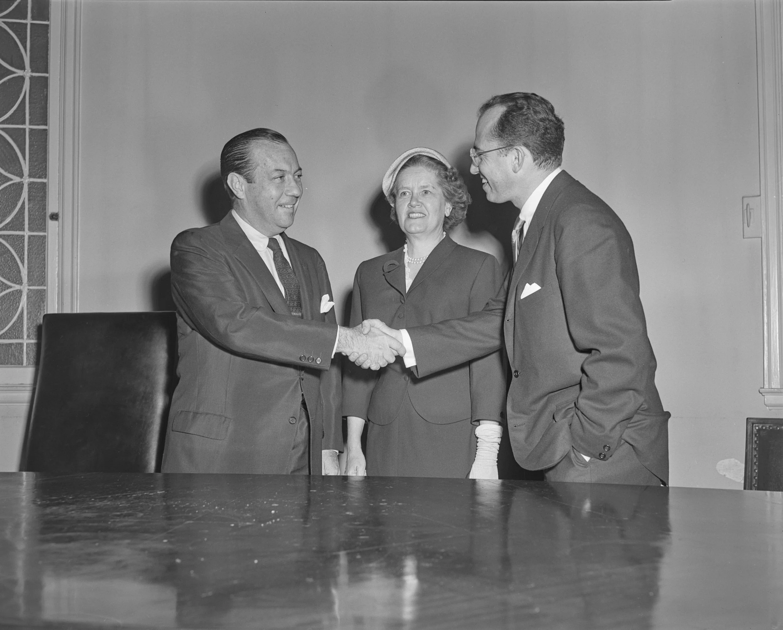 Robert F. Wagner with Dr. Leona Baumgartner, Commissioner of Health, and Dr. Jonas Salk, June 1, 1955. Department of Health Collection, NYC Municipal Archives.