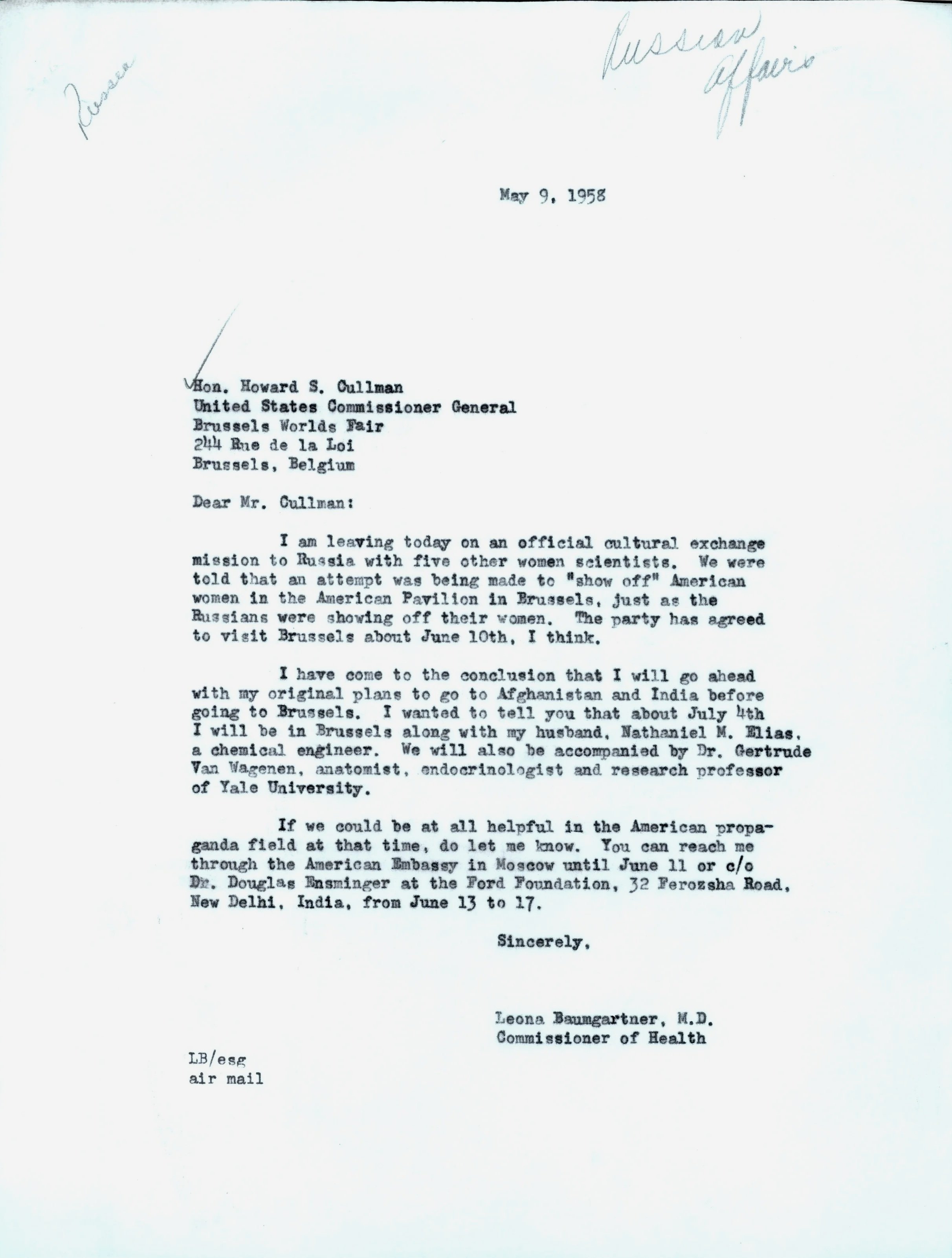 Commissioner Baumgartner writes to a Belgian official about her planned trip to Europe, Southeast Asia, the Middle East and the USSR as a representative of American women in the health field. REC0050 Health Commissioners Papers, NYC Municipal Archives.