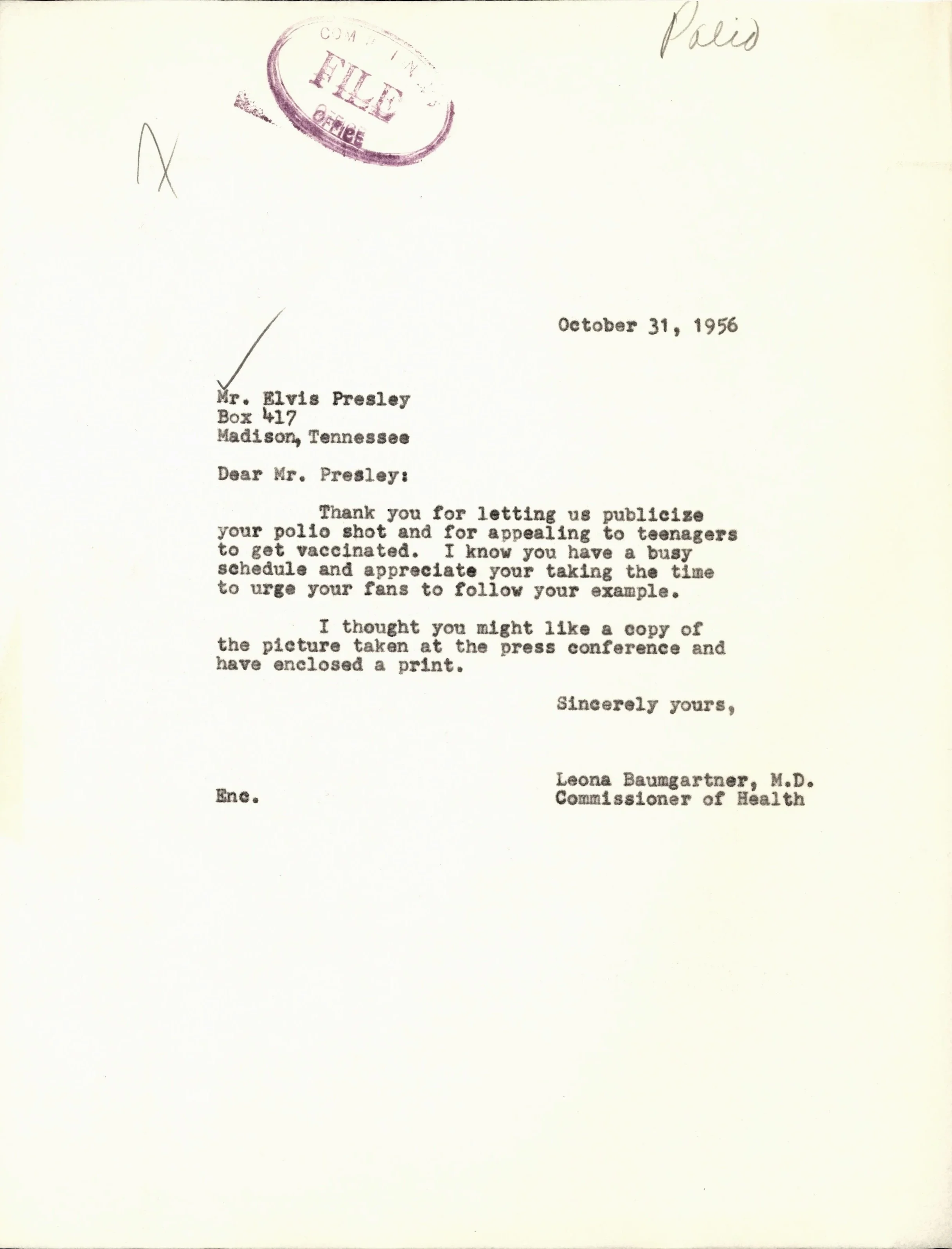 Letter from Commissioner Baumgartner to Elvis Presley thanking him for helping to raise awareness of the new polio vaccine by getting the shot from health officials in front of the cameras. REC0050 Health Commissioners Papers, NYC Municipal Archives.