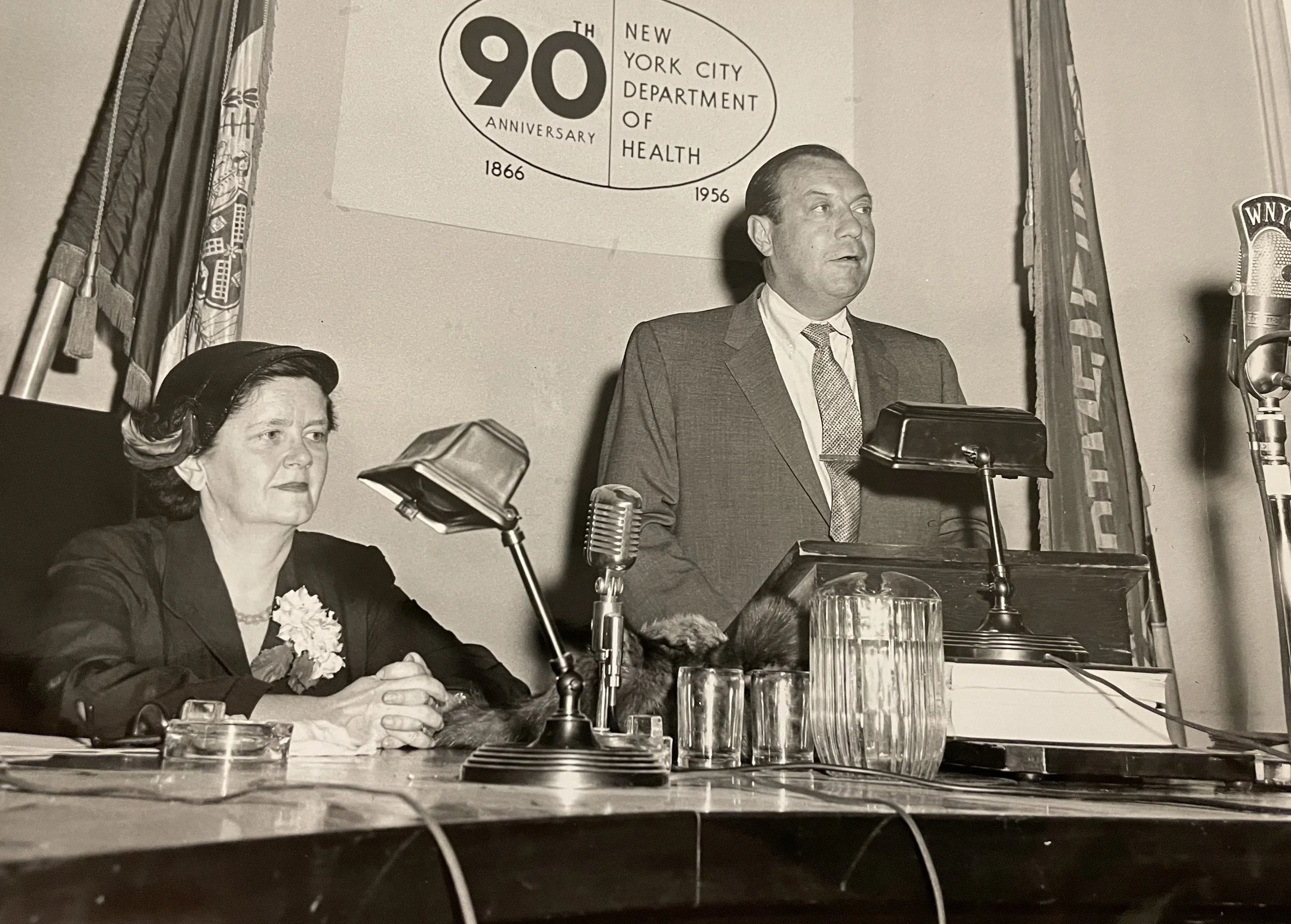 Commissioner Leona Baumgartner and Mayor Robert F. Wagner at the 90th Anniversary program for the Department of Health, May 15, 1956. Photo by Bob Olivero. Department of Health Collection, NYC Municipal Archives.