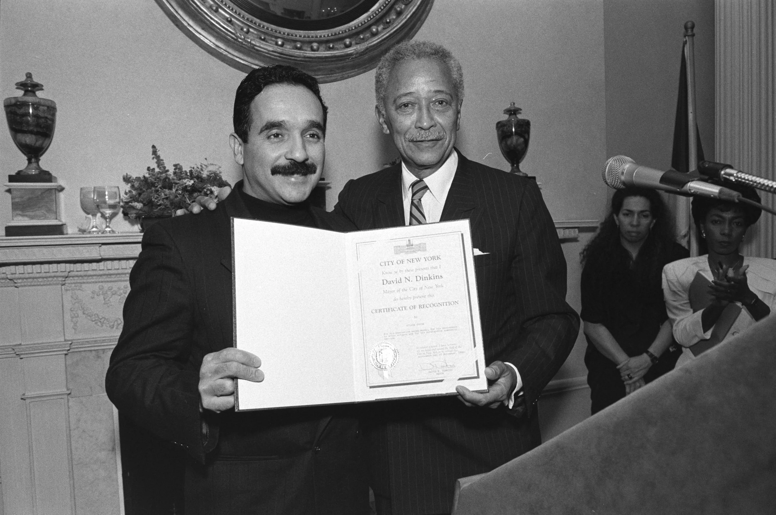 Mayor David Dinkins presents the Certificate of Recognition to Willie Colón, City Hall, November 16, 1990. Mayor David Dinkins Photograph Collection. NYC Municipal Archives.
