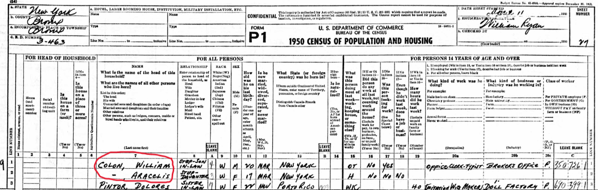 1950 Census Record showing Willie’s parents, William and Aracelis Colón.