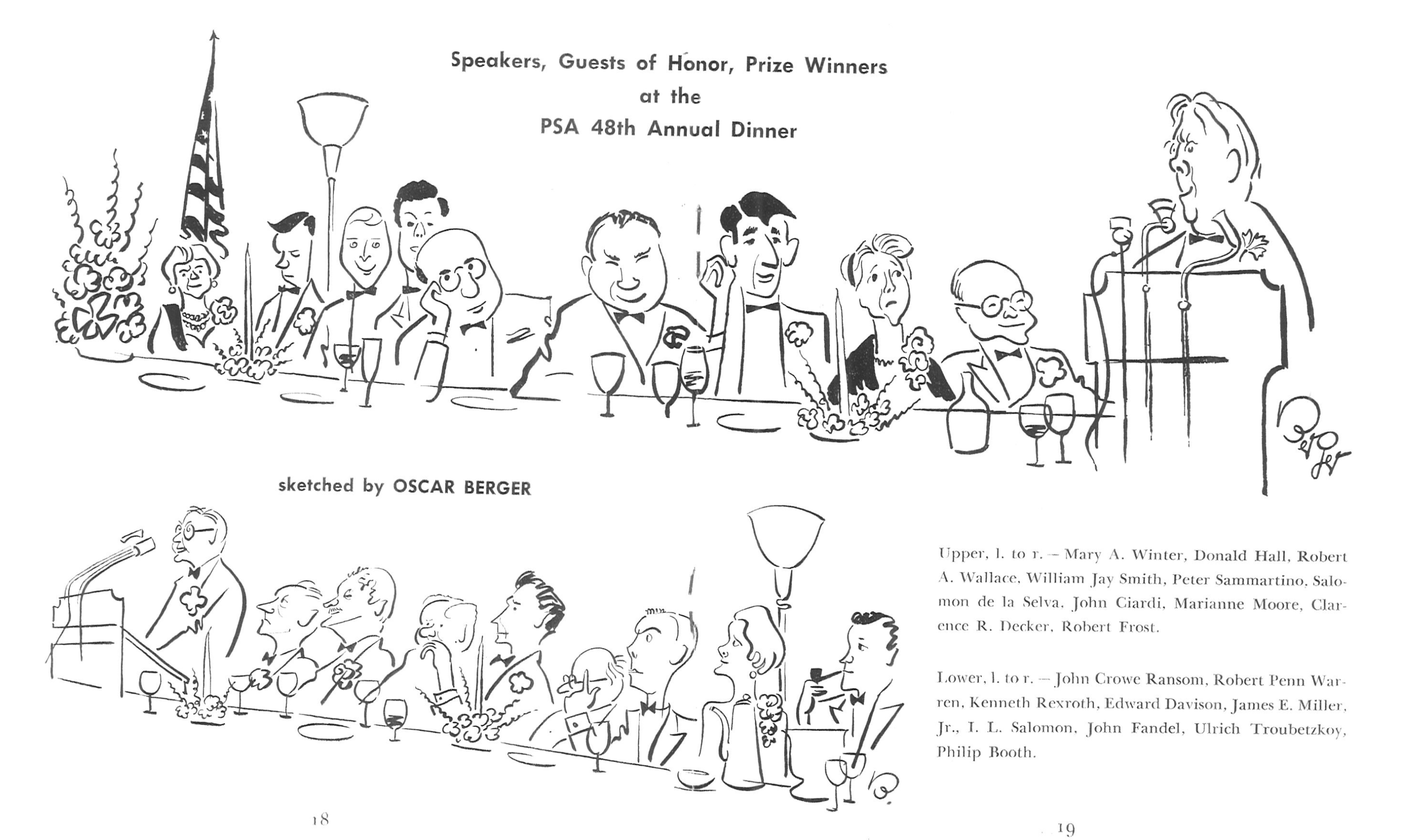 When WNYC covered the Poetry Society of America’s forty-eighth annual dinner in 1958, the guest of honor was Robert Frost. By then widely regarded as the nation’s elder poet, Frost used the occasion to gently mock the public image that had grown around him, downplaying the notion that he possessed any special wisdom. Meanwhile, the society had the well-known caricaturist Oscar Berger draw the dais attendees for the organization’s journal.