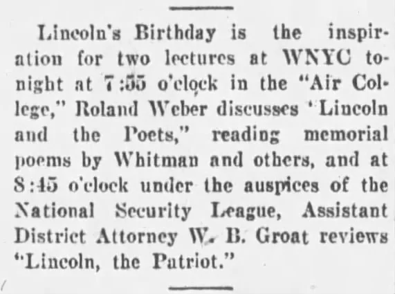 As a non-commercial municipal station, however, WNYC was uniquely positioned to elevate cultural standards without the constraints of sponsorship. Through its Air College programming—developed with the City University of New York and other institutions beginning in 1927—the station offered lectures and courses that regularly featured poetry. These broadcasts included a wide range of works from Emily Dickinson and Edwin Arlington Robinson to Carl Sandburg and Hart Crane. Newspaper listings are unclear about whether the future U.S. Poet Laureate Joseph Auslander’s May 27, 1927, studio appearance was part of the Air College series, though it is likely.