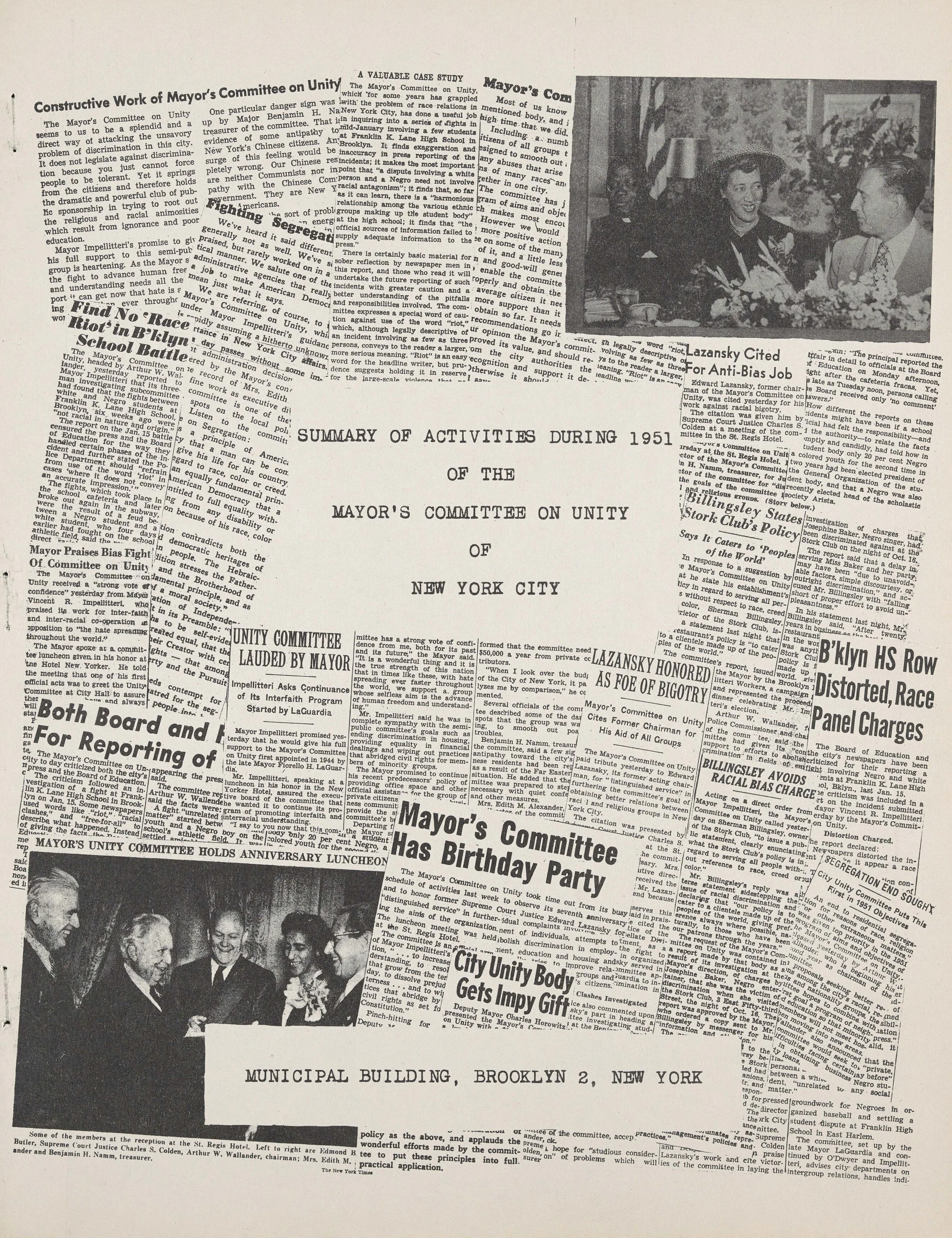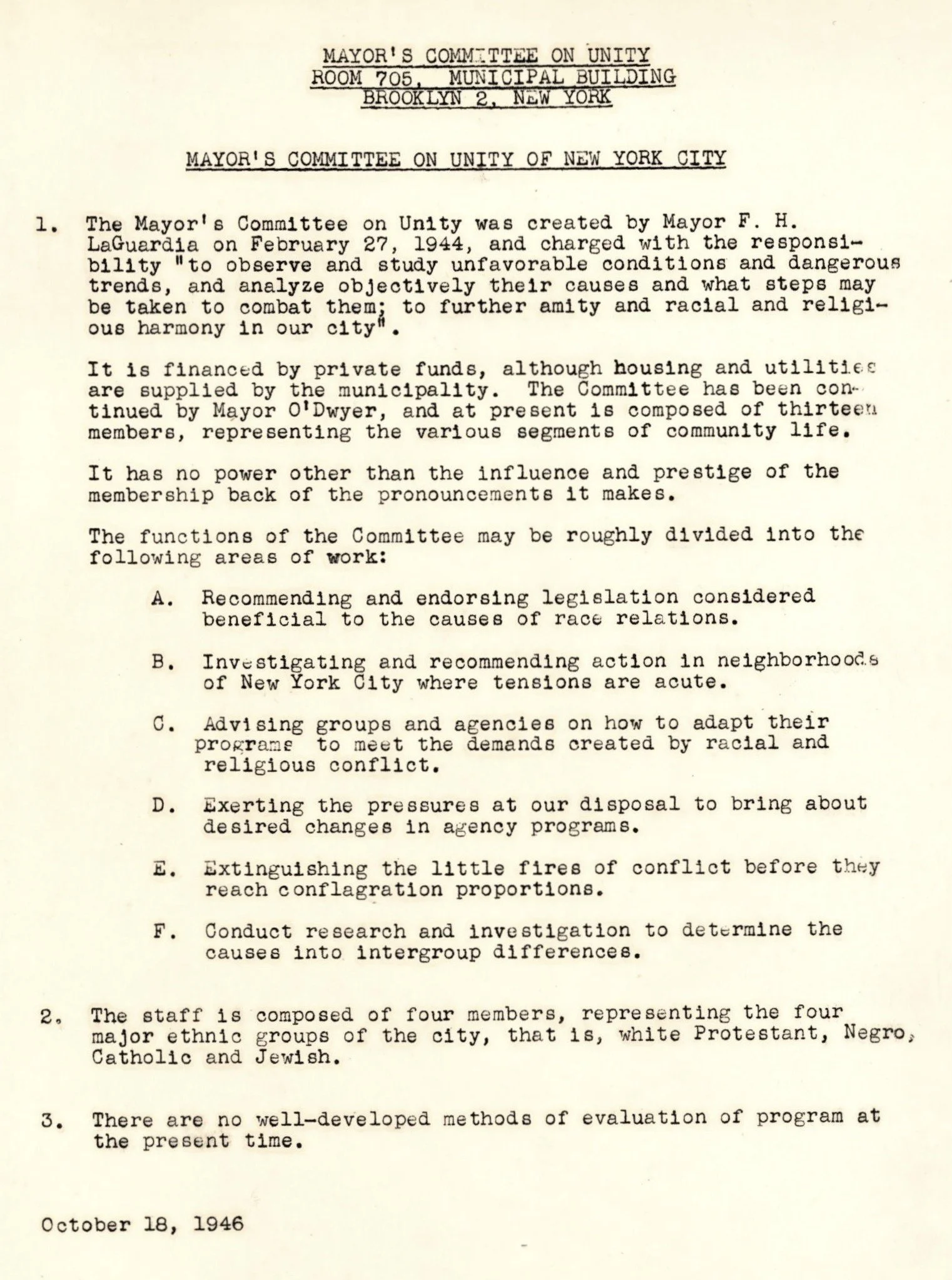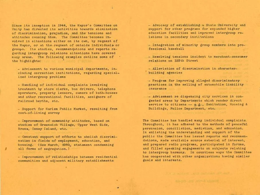 By Executive Order, Mayor Fiorello H. LaGuardia created the Mayor's Committee on Unity in response to growing concerns about race relations and religious discrimination in the City. The purpose was to "make New York City a place where people of all races and religions may work and live side by side in harmony and have mutual respect for each other, and where democracy is a living reality." MCOU was led by a dedicated (and integrated) executive team and volunteer committee members. Without any legal authority, the Committee was tasked with researching, analyzing and proposing recommendations to address persistent discrimination and social inequities. The Committee on Unity continued to serve under mayoral administrations following LaGuardia.