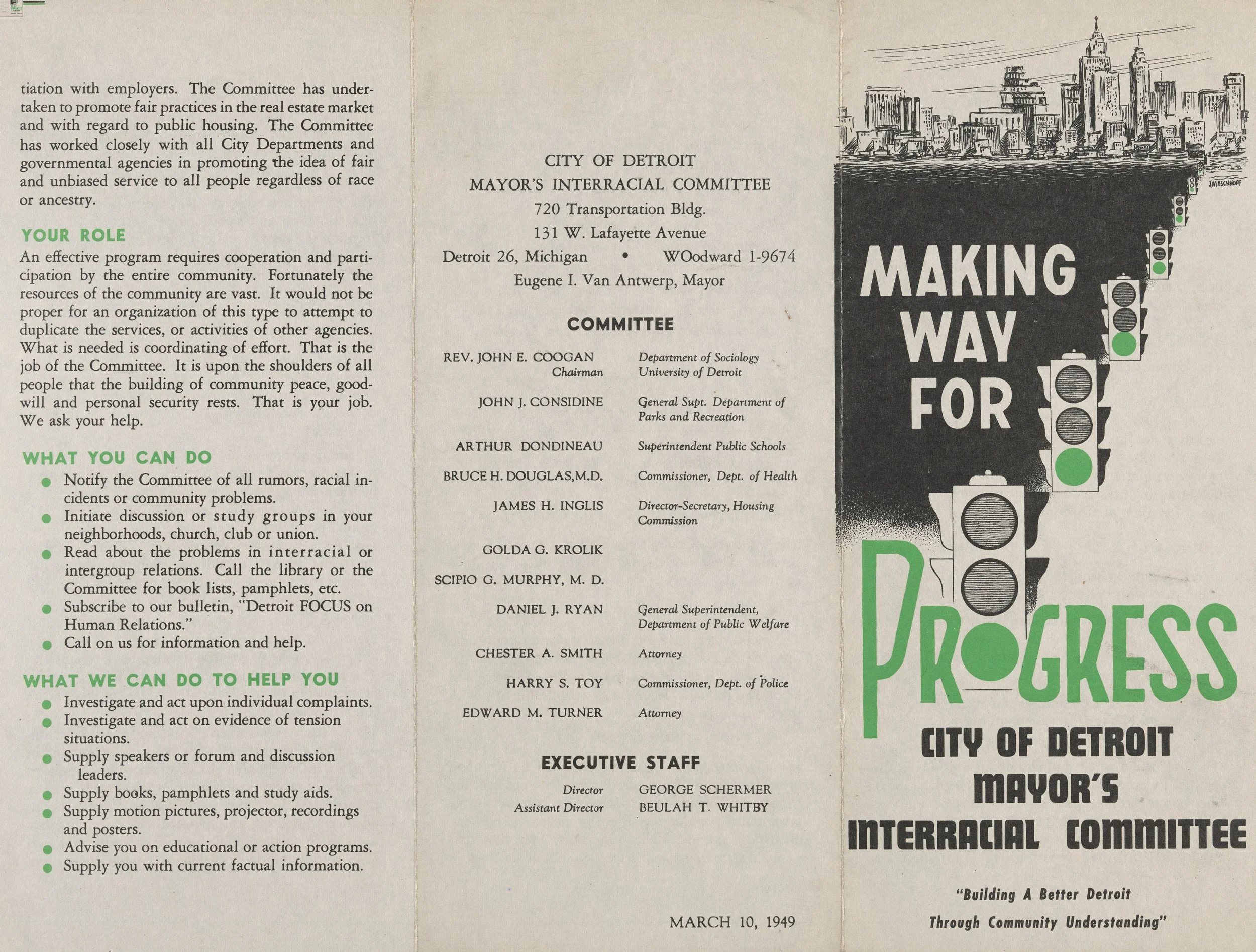 While the New York City Mayor’s Committee on Unity was the first government agency in the country to take on the issue of civil rights, it was not long before other urban centers began to follow suit. The idea of ending discrimination and making changes in policies to improve race relations and social equities was in the air in the post-war era. National and local government agencies as well as civic groups began organizing and working to bring about unity in communities throughout the country.