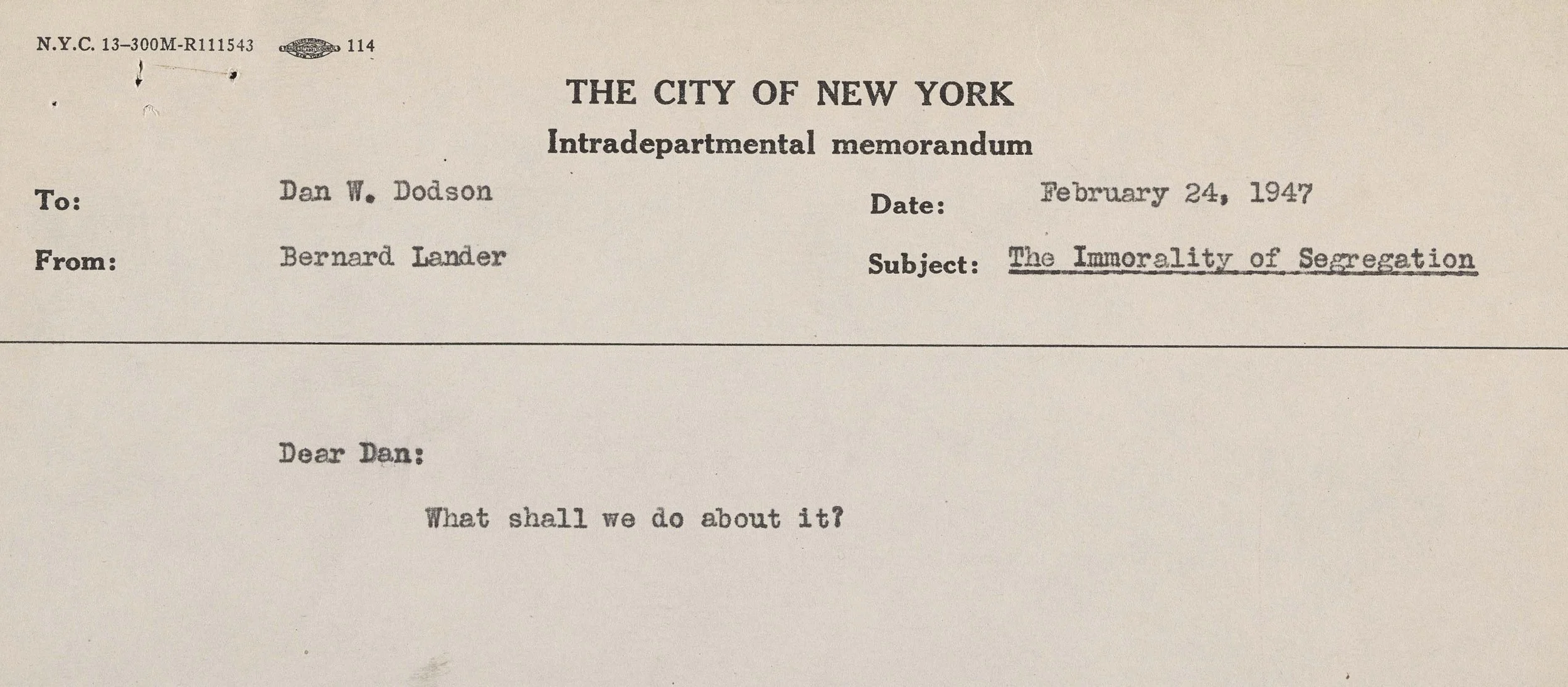 This simple but poignant memo was written by MCOU Associate Director Rabbi Bernard Lander to Executive Director Dan Dodson. Lander would later go on to found Touro College and Dodson, an NYU professor, was also a member of the Mayor’s Committee on Baseball which helped integrate baseball in 1947.